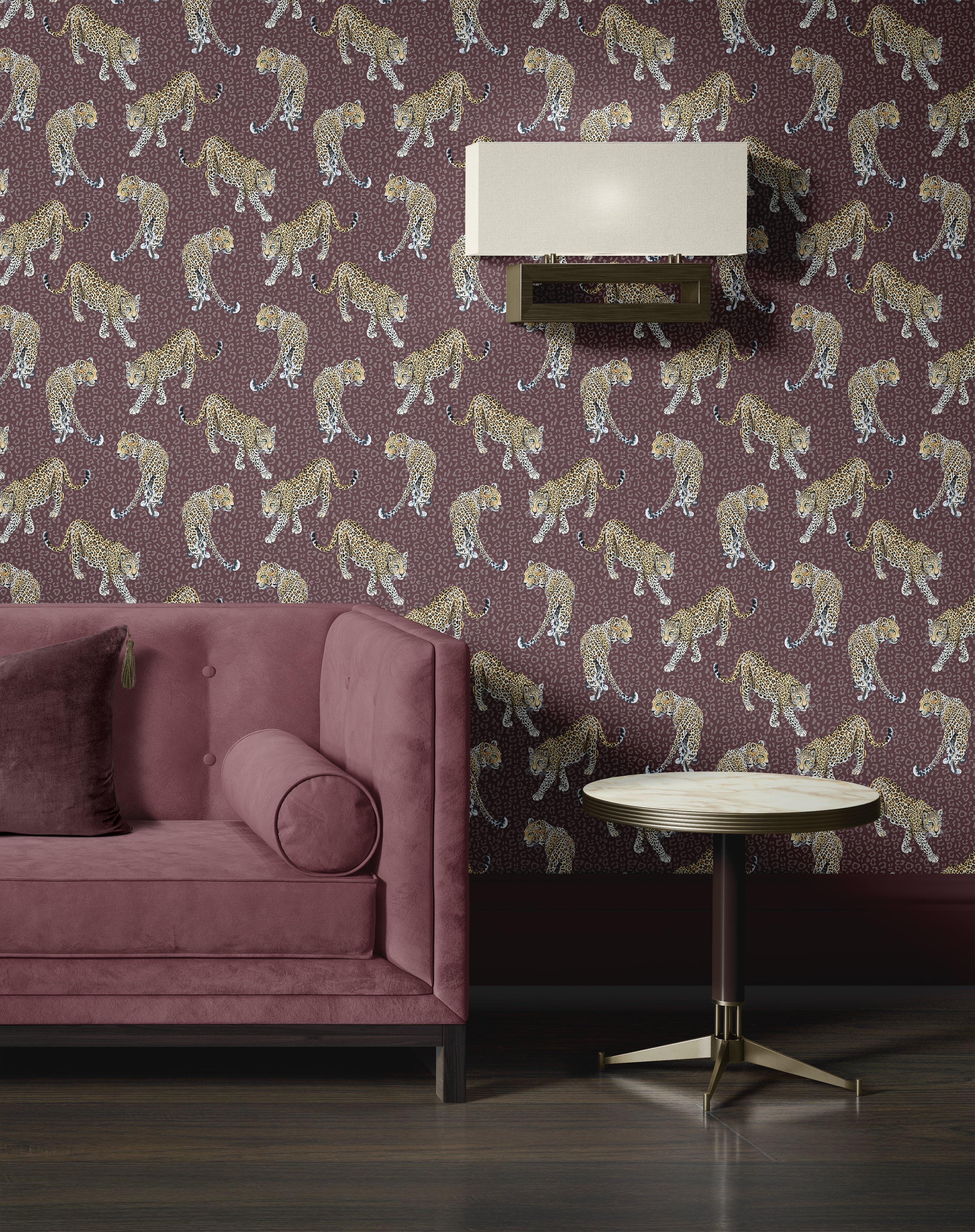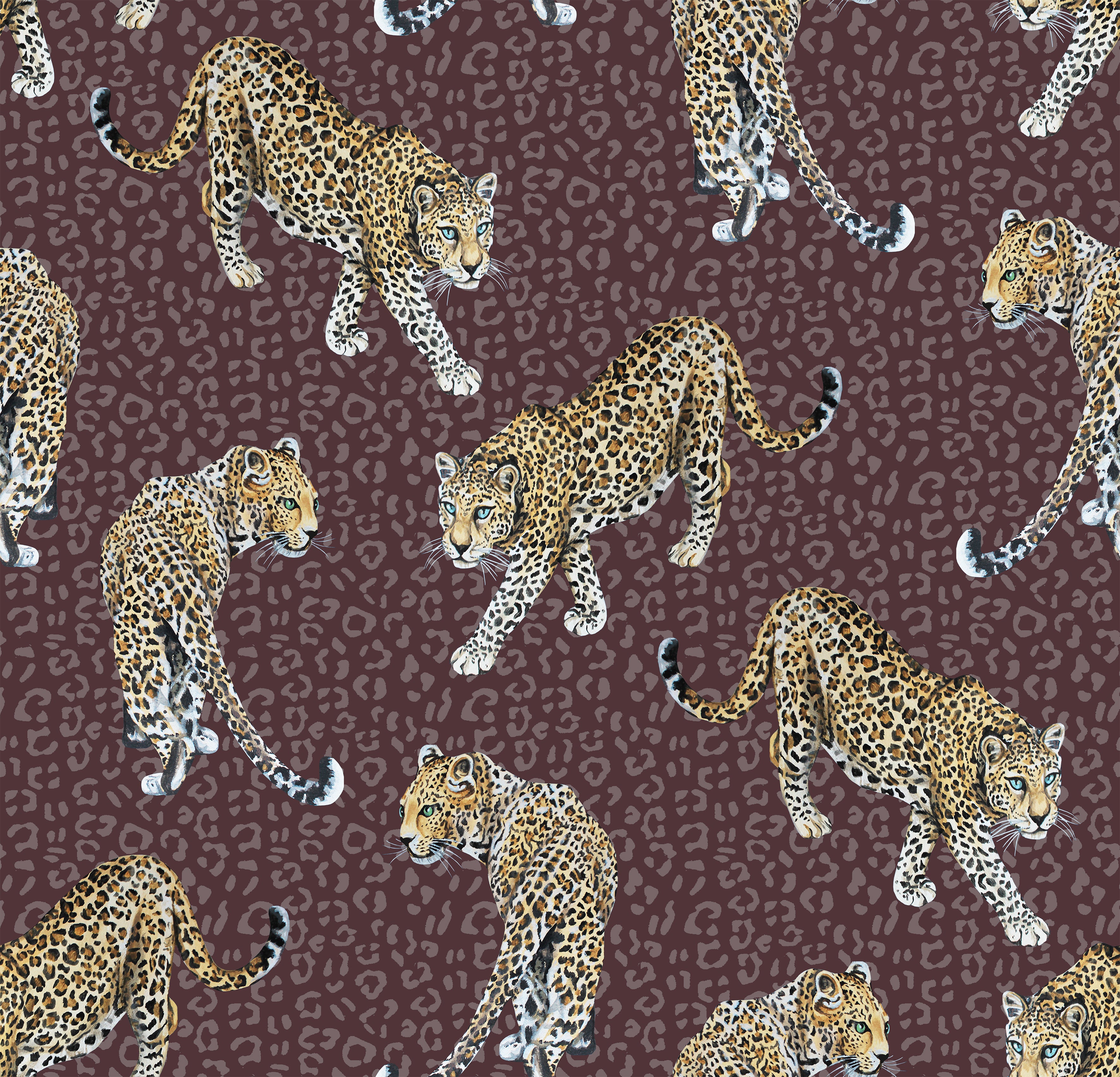 • A beautifully captivating wallpaper design by Abi Bartlett featuring sophisticated hand illustrated leopards elegantly prowling across a rich tonal leopard skin background. This simple yet striking pattern is bold and dramatic whilst evoking a touch of refined glamour and luxury perfect, making it an ideal choice for a modern interior.